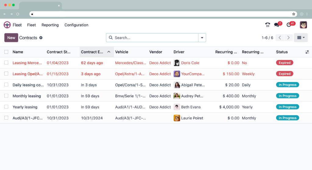 Supervise all contracts for your vehicles and receive a warning email when contracts reach their expiration date. Several visual tools are put in place to ensure that you'll remember to renew (or end) your contract. Organize the services around the vehicles and communicate with the qualified service providers; manage invoices and notes. Set up a vehicle policy within your company, as well as an insurance policy in order to manage your fleet in the most efficient way.
