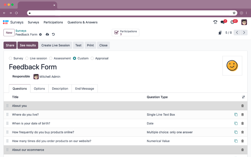 Easy from the start thanks to an extremely user-friendly interface, Odoo Surveys allows you to create and edit surveys with no effort. React to your marketing needs and provide studies anytime. Run your statistics, measure response rates and extract the analysis in a few clicks. Don't waste time on the process and focus on qualitative and quantitative analysis.