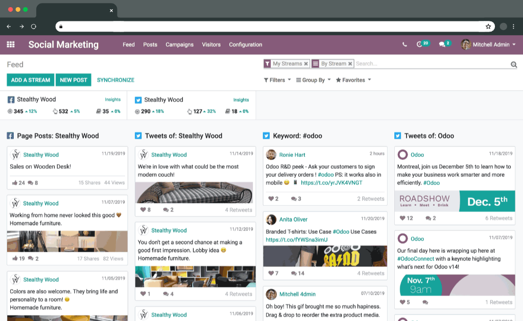 Offering modules in Social Marketing, Email Marketing, SMS Marketing, Events, Marketing Automation, and surveys. Odoo has you covered.