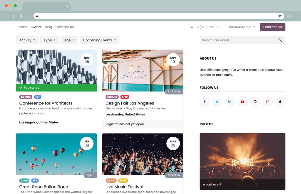 Odoo Events covers all aspects of an Event Planner's job from event organization and ticket sales to visibility and promotion.