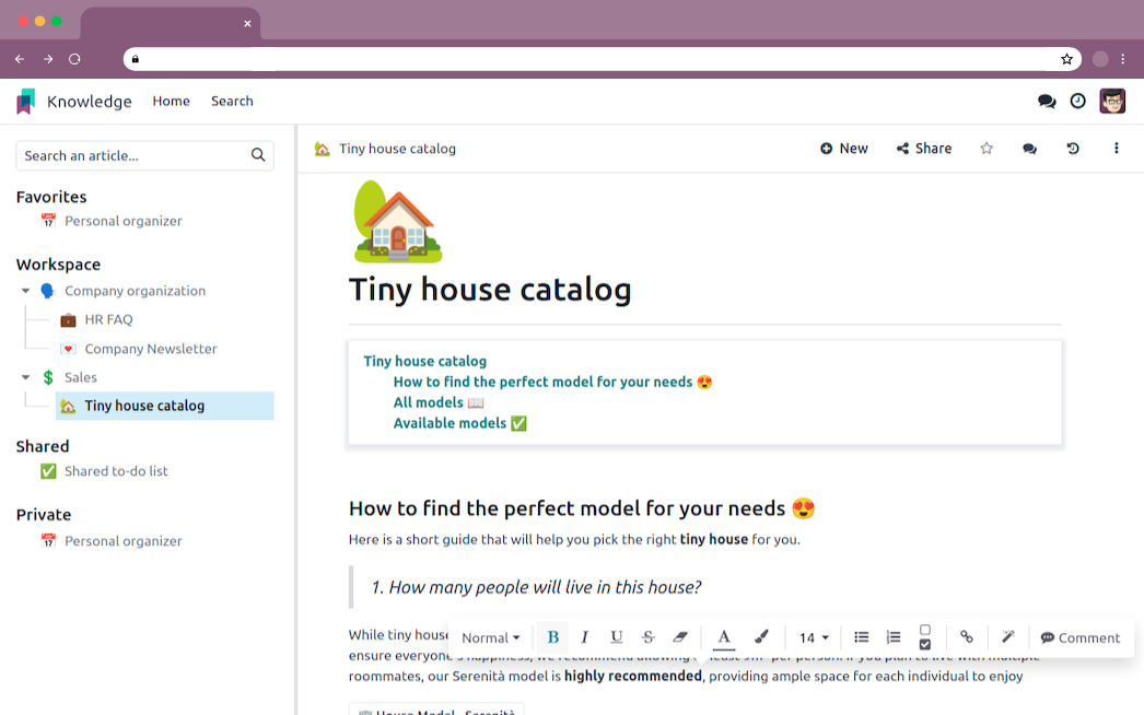 Odoo Knowledge lets you centralize all your organization’s important information, work on it as a team, and access it from any Odoo app.