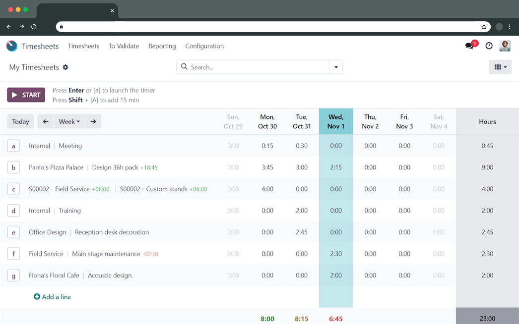 Odoo Timesheets allows your team to track and validate billable hours, approve time spent on tasks, and simplify invoicing your services. All in one, hassle-free interface.